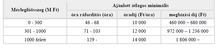 A könyvvizsgálói díjak számszerű meghatározásához iránymutatásként alkalmazható a megbízó gazdálkodó szervezet méretét kifejező két fő mutatószám valamelyike alapján történő díjszámítás (egyszerűbb módszer). Hangsúlyozzuk, hogy ennél a módszernél is fontos tényező a konkrét egyedi könyvvizsgálati megbízásra fordítandó szükséges (becsült) munkaóra ráfordítás mennyiségének a megtervezése és annak összevetése az alábbi táblázatokban megadott ajánlott minimális munkaóra ráfordításokkal. A táblázatban megadott ajánlott munkaóra ráfordításoktól való jelentős eltérések az adott gazdálkodóra jellemző egyedi sajátosságokból adódhatnak, mely esetben a megbízási díjat indokolt lehet az alábbiak szerint ajánlott minimális megbízási díjaktól eltérően megállapítani.